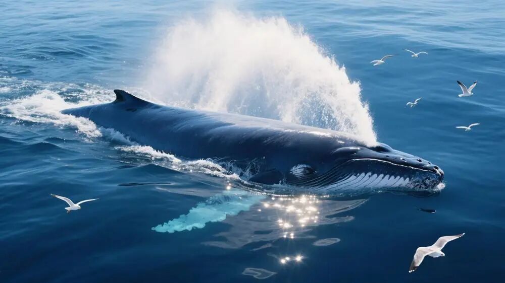 它的舌头重量约为2.7吨,与一头成年亚洲象的体重相当,肺活量高达5000升,呼吸时喷出的水柱可达12米高,成为海洋中醒目的标识。