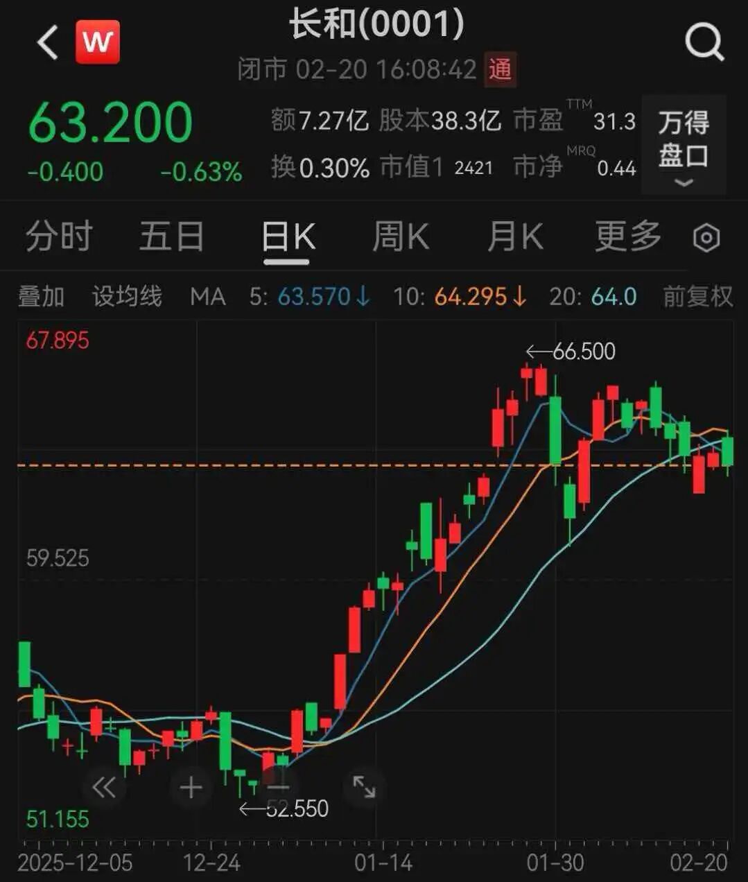 截至2月20日收盘,长和股价报63.2港元,跌0.63%,总市值约为2421亿港元。